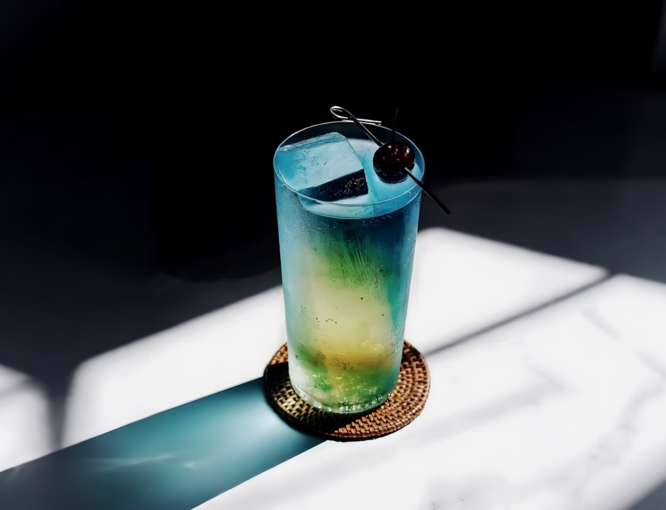 ブルーキュラソーシロップ10ml + レモンジュース10ml + 80%炭酸水、かき混ぜてウイスキー60mlを加えます。