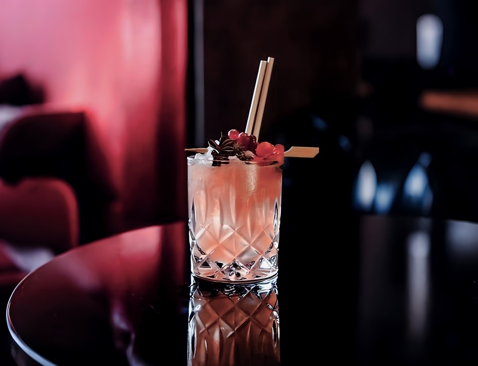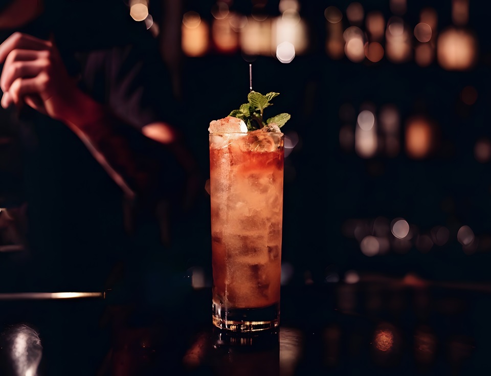 グラスの底にザクロシロップ5mlを入れ、氷を入れます、ウイスキー30ml + オレンジジュース90ml + ソーダ水。